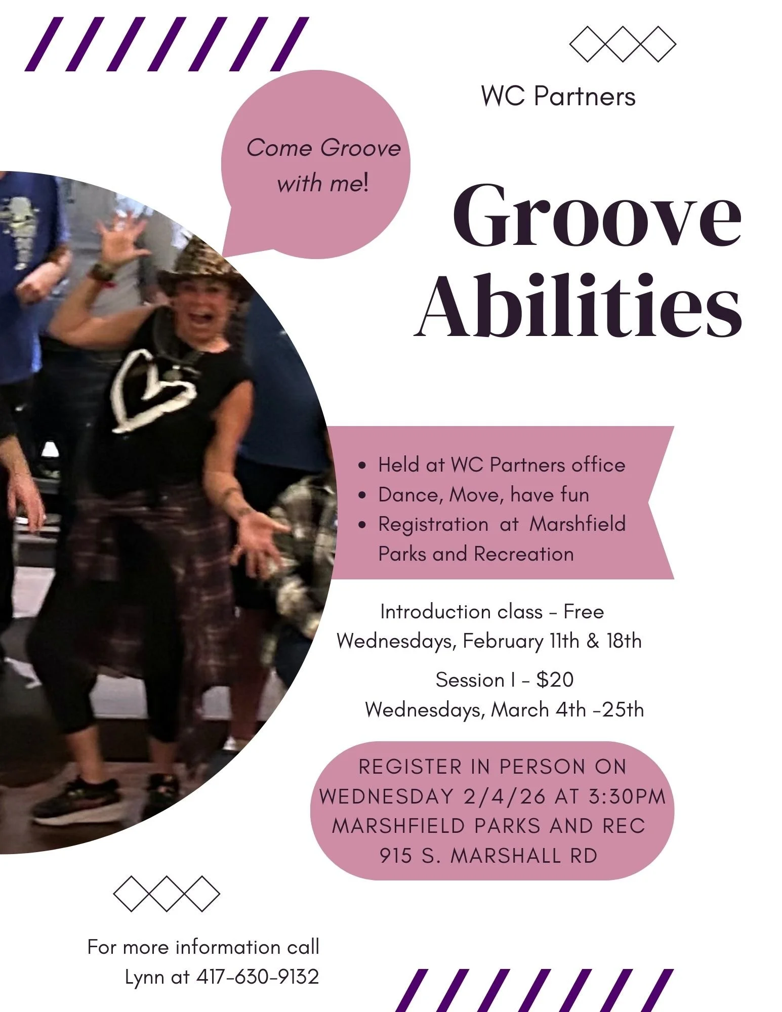 Join the Groove class to dance, move, and have a great time. This class will be held at the WC Partners office and is provided in partnership with Marshfield Parks and Recreation.